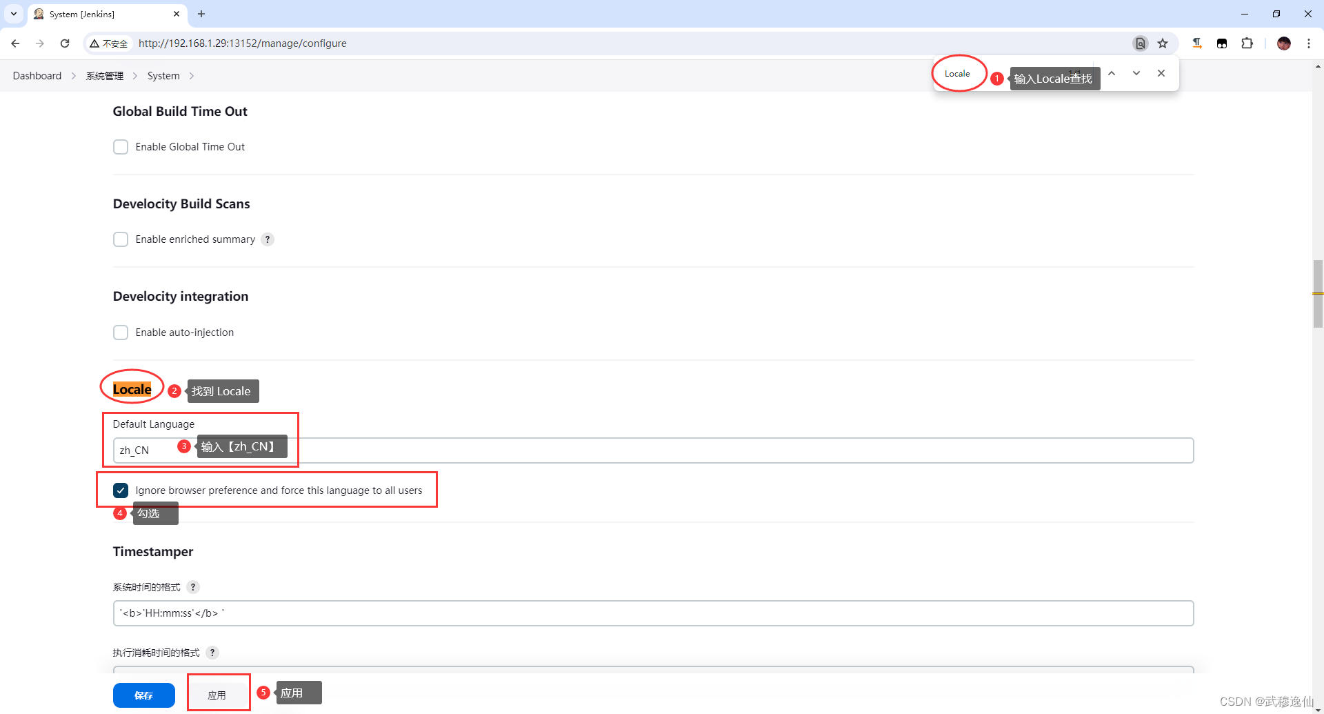 进入系统配置页面后,Ctrl+F ,输入Locale 查找到Locale,在“Default Language”栏输入【zh_CN】,勾选【Ignore browser preference and force this language to all users】