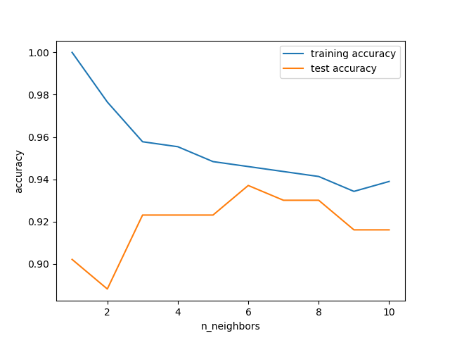 import matplotlib.pyplot as plt import mglearn from scipy import sparse import numpy as np import matplotlib as mt import pandas as pd from IPython.display import display from sklearn.datasets import load_breast_cancer import sklearn as sk from sklearn.model_selection import train_test_split from sklearn.neighbors import KNeighborsClassifier cancer = load_breast_cancer() X_train,X_test,y_train,y_test =train_test_split(cancer.data,cancer.target,stratify=cancer.target,random_state=66) training_accuracy=[] test_accuracy=[] neighbors_settings = range(1,11) for n_neighbors in neighbors_settings: clf = KNeighborsClassifier(n_neighbors=n_neighbors) clf.fit(X_train,y_train) training_accuracy.append(clf.score(X_train,y_train)) test_accuracy.append(clf.score(X_test,y_test)) plt.plot(neighbors_settings,training_accuracy,label="training accuracy") plt.plot(neighbors_settings,test_accuracy,label="test accuracy") plt.xlabel("n_neighbors") plt.ylabel("accuracy") plt.legend() plt.show()