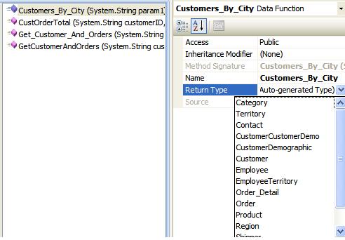 选中该函数后,右击属性。就可以使用其他影射类。但是Linq会对返回的rowset做检查,如果发现返回结果和影射不匹配它会报错。而且一旦更改了,当你需要改回去的时候,你只能在Designer中删掉此sprocs,然后重新拖过来。