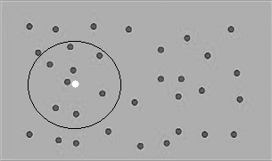 设某回归任务的输入包含两个变量,将它们的值视为平面上点的坐标。如图2.1所示,灰点代表训练数据中的输入,白点代表输出待预测的输入。假如采用2.3节介绍的平均值法,当白点与黑点重合时,因为在该处只有一个训练实例,所以平均值不能很好地代表期望值;而当白点处于更有可能的其他位置时,因为在该处没有训练实例,无法预测输出值。为走出此困境,自然的想法是,在计算平均值时,扩大取其输出的实例的范围。假设输出待预测的输入为x,原来要求找到训练数据中输入等于x的实例,现在则放宽到所有输入处于x的某邻域的实例。在图2.1中,以白点为中心所画的圆就代表一个这样的区域,在该区域内,可用于为白点取平均值的灰点有8个。