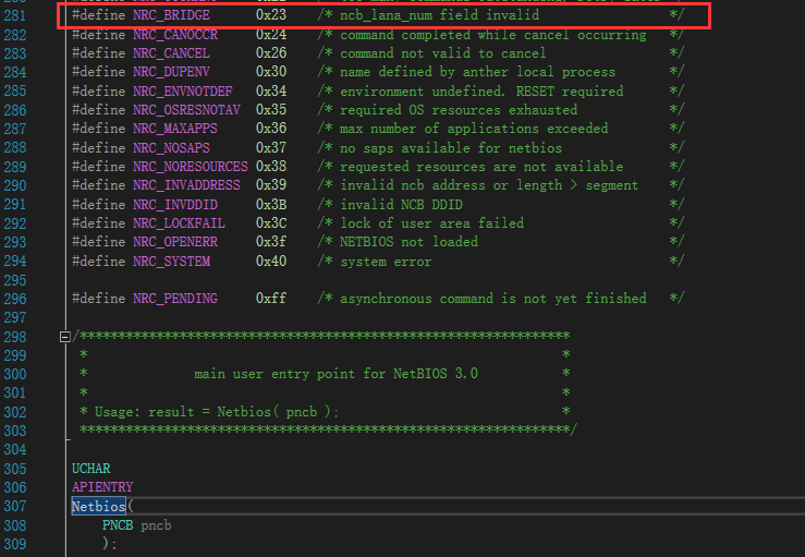 显然没有成功获取到MAC地址,再看打印的内容,本来 Netbios() 函数执行过后的返回值应该是0x00,但是结果返回的是0x23,于是在VS中右键Netbios函数 -> 转到定义,上下翻了一下,发现,找到了NETBIOS返回值及含义,如下图