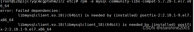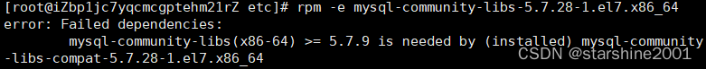 描述:在CentOS7中卸载mysql中途,在删除mysql相关文件的时候产生依赖报错,具体如图: