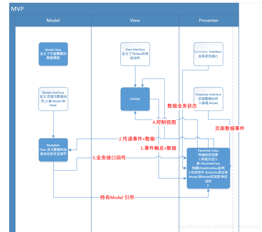 据获取好了返回给 Presenter,Presenter 去刷新 View。PV,PM 双向依赖