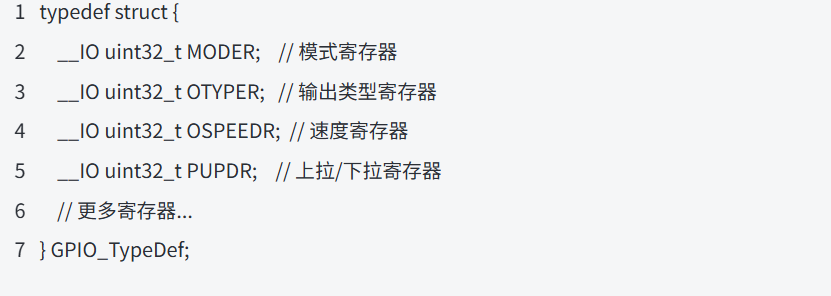 - 设备驱动接口:封装硬件寄存器映射(如 GPIO 结构体):