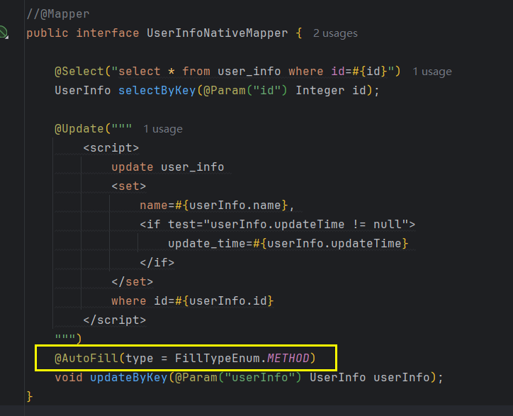 这里使用了注解的方式,如果updateTime不为空,才会更新。