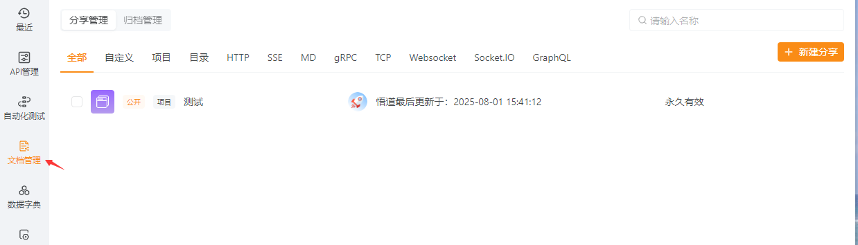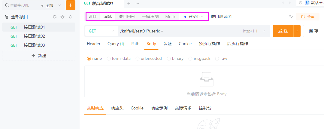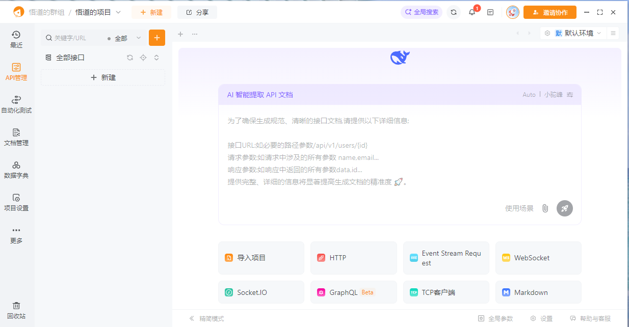 在这里可以新建各种接口或者上传项目中的接口。可以在这里进行设计、调试、压测等