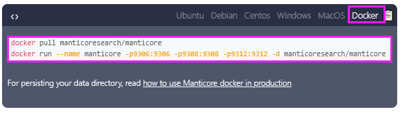 docker run --name manticore -p9306:9306 -p9308:9308 -p9312:9312 -d manticoresearch/manticore