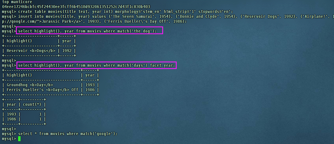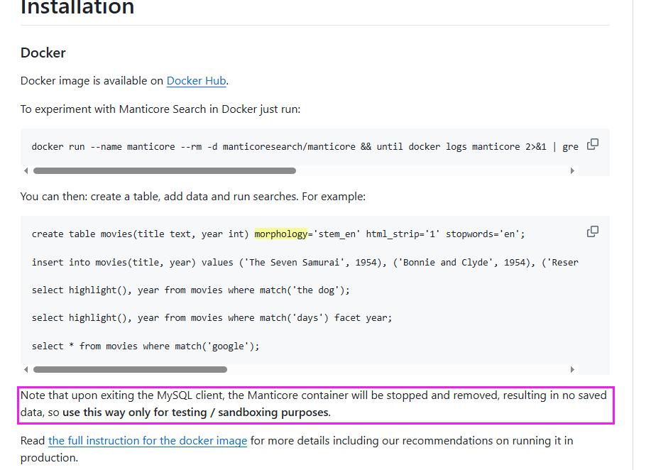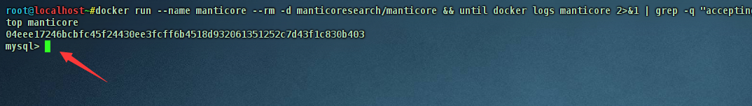 docker run --name manticore --rm -d manticoresearch/manticore && until docker logs manticore 2>&1 | grep -q "accepting connections"; do sleep 1; done && docker exec -it manticore mysql && docker stop manticore