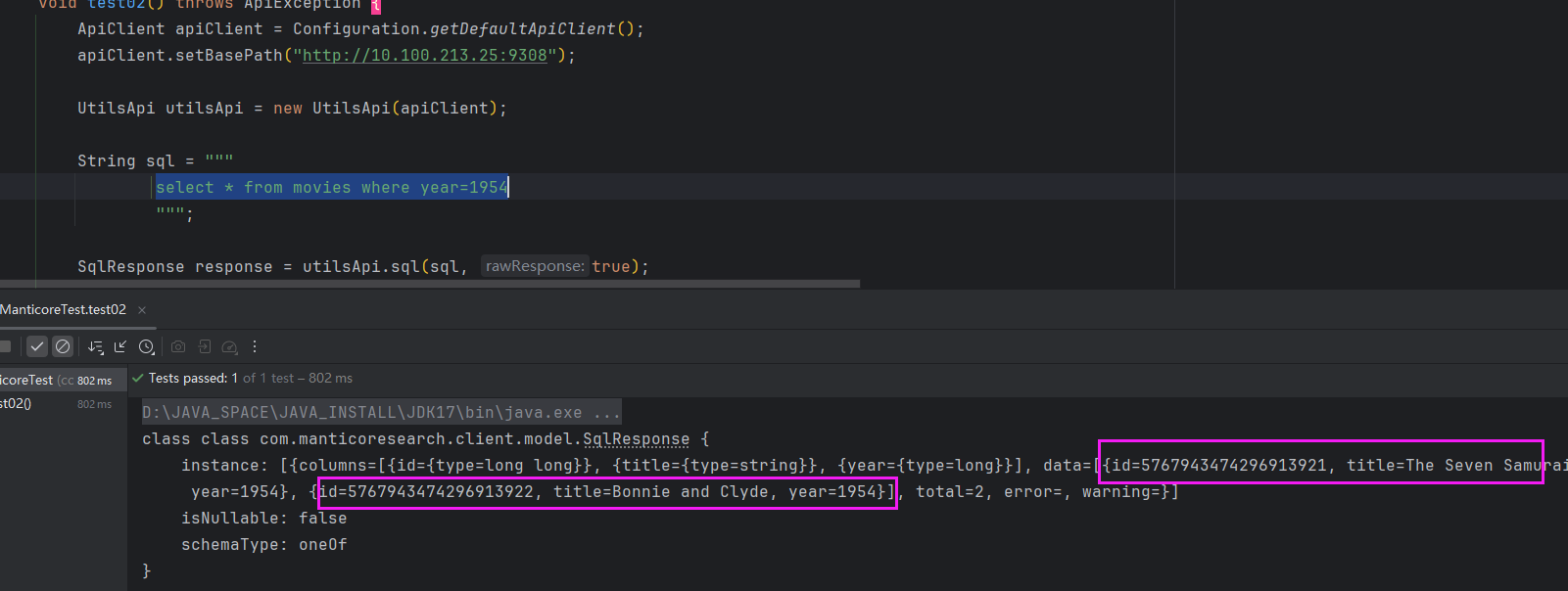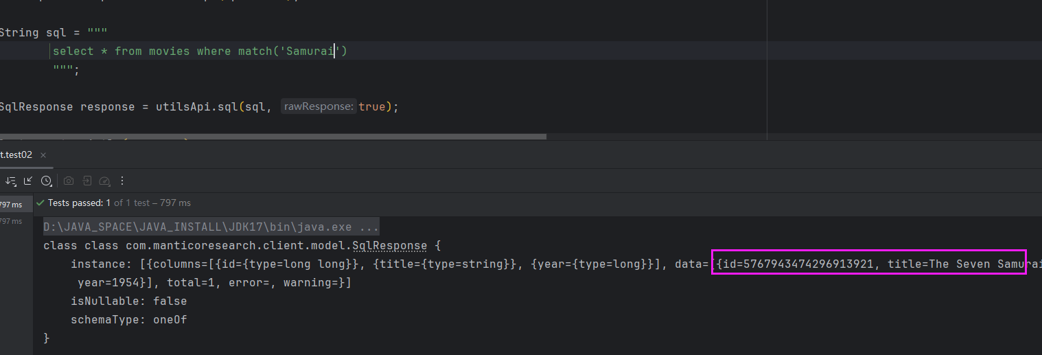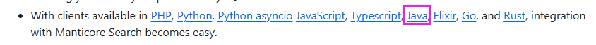Manticore Search 的 SQL 语法是其一大亮点。并提供了多种客户端,我们以Java为例: