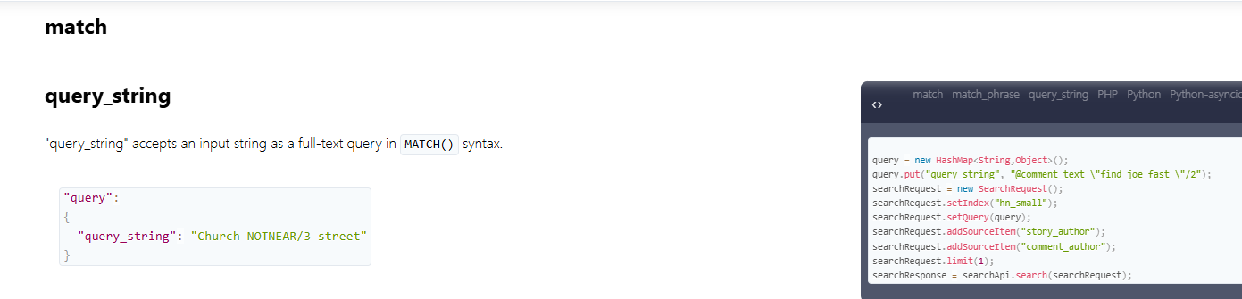 详细语法可以查看:https://manual.manticoresearch.com/Searching/Full_text_matching/Basic_usage