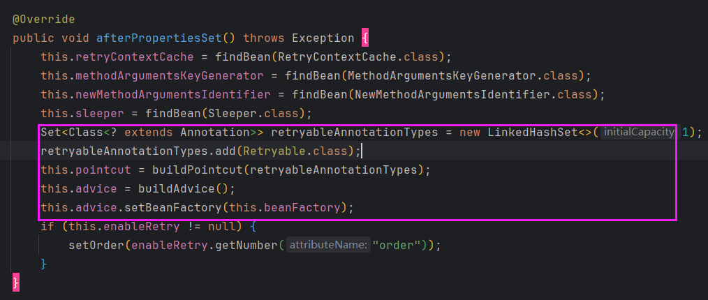 画框的地方,正式通过@Retryable注解构造AOP的切点和通知等。这样一起项目启动之后,当调用该方法时,代理会介入执行,按照预设的重试策略(Retry Policy)和回退策略(Backoff Policy)进行重试。