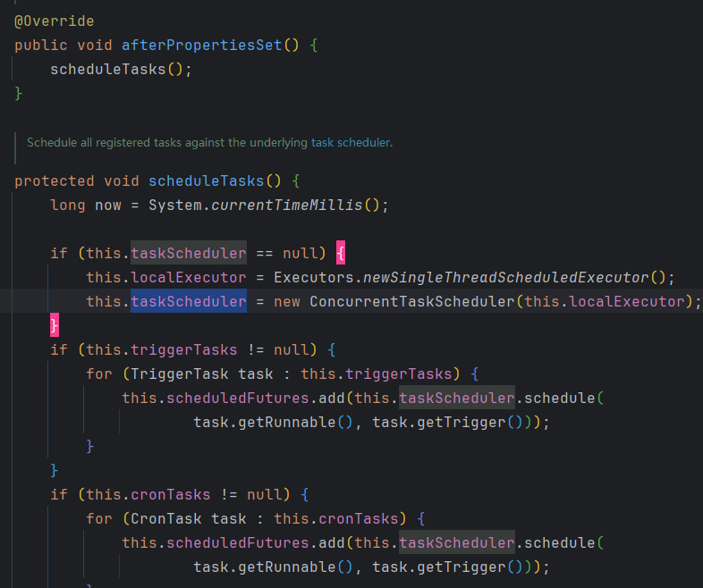 然后调用afterPropertiesSet()方法,来增加调度任务。