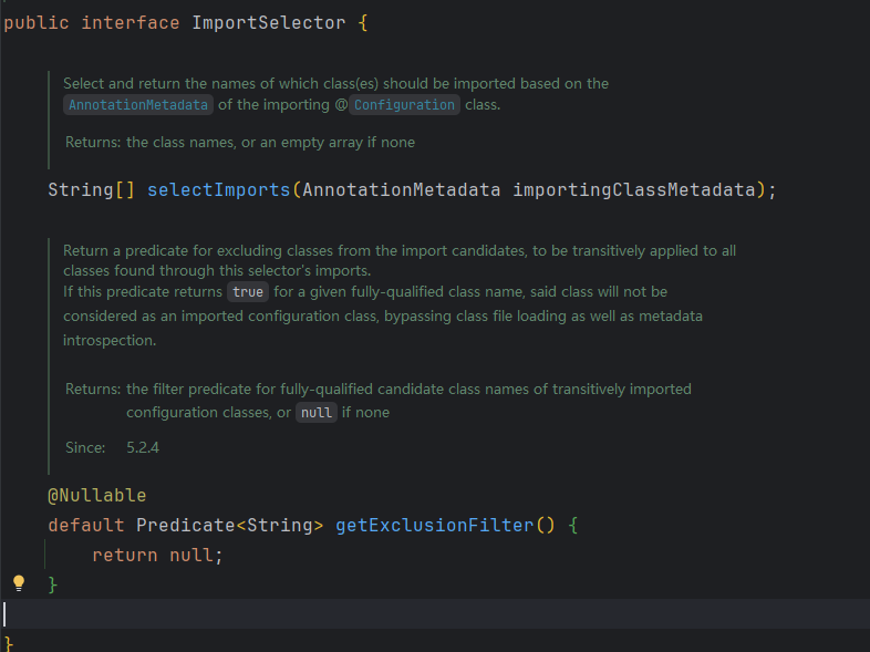 selectImports方法时在Spring 3.1时才有的,而在Spring 5.2.4的新版本中有新增了getExclusionFilter,用来过滤不必要的资源。