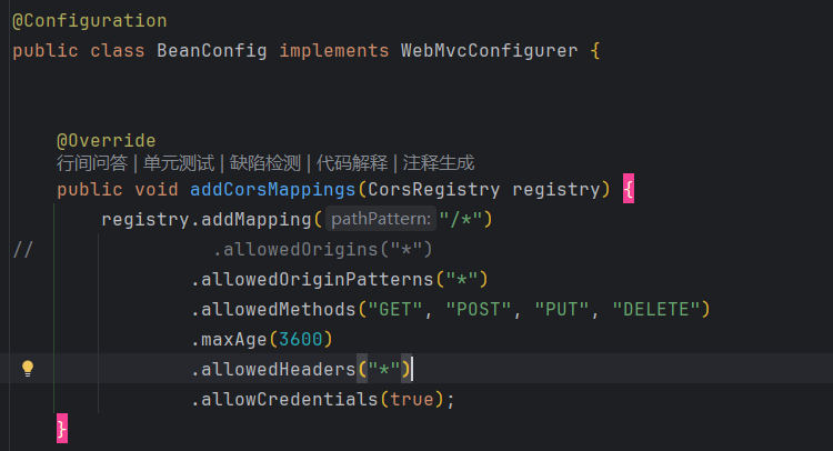 这里要说的就是allowedOrigins和allowedOriginPatterns的区别。测试的时候发现配置allowedOrigins("*")是不生效的。