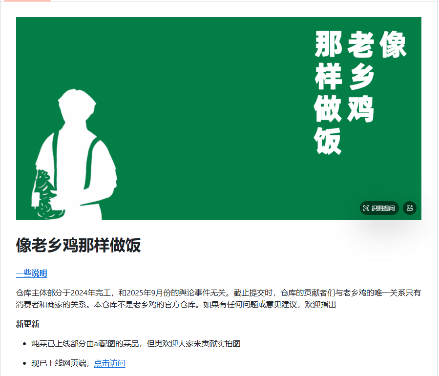 想象一下,当你走进老乡鸡餐厅,点上一碗招牌鸡汤,那浓郁的香气瞬间唤醒你的味蕾。但今天,我们要聊的不是如何品尝这碗鸡汤,而是其菜谱被一个名称CookLikeHOC的项目开源了,并迅速获得17.4k的star。