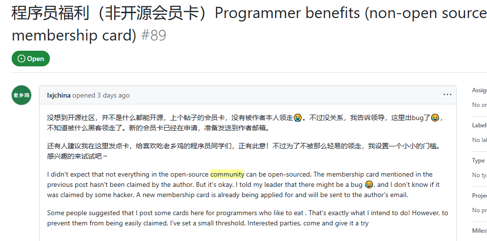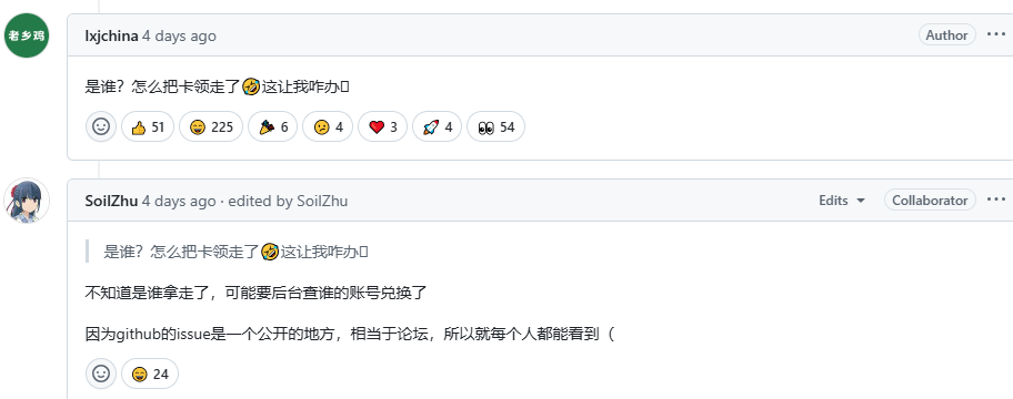 这个Issues是老乡鸡官方提的,直接送了一张1000元的会员卡。