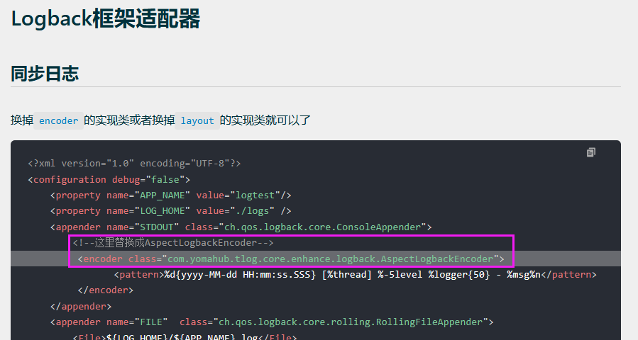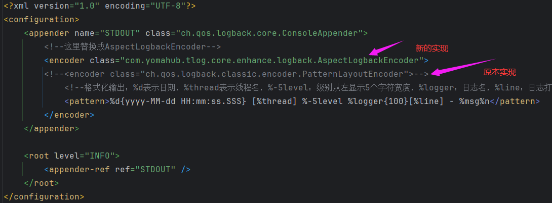 就是将encoder的实现类ch.qos.logback.classic.encoder.PatternLayoutEncoder,换成com.yomahub.tlog.core.enhance.logback.AspectLogbackEncoder就好了。