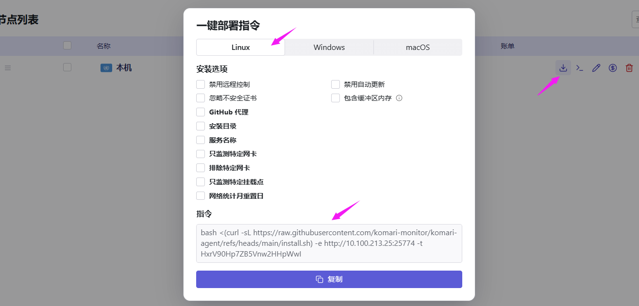 部署的命令根据服务的类型而不同,这里以Linux为例。安装的选项,可以按需选择。然后复制指令即可: