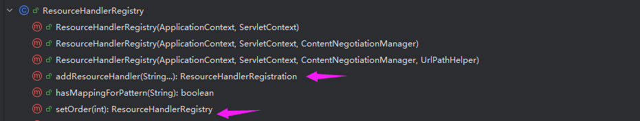 ResourceHandlerRegistry可操作的就是addResourceHandler和setOrder()方法,分别用来映射静态资源的路径以及顺序。