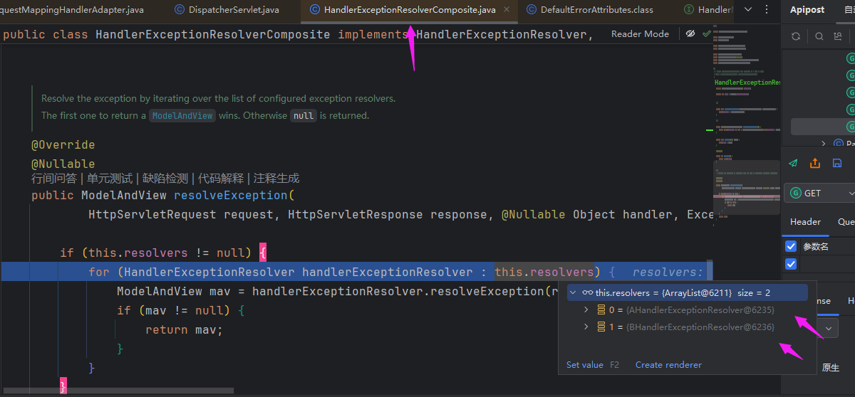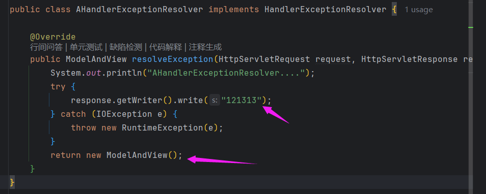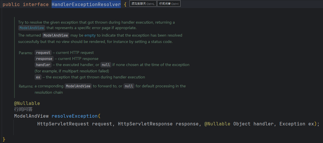 返回值为null表示继续后面的异常解析器解析,返回ModelAndView表示异常解析中断,直接返回结果。
