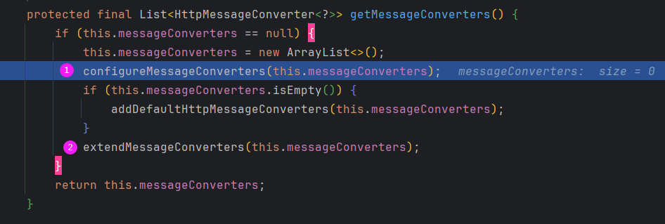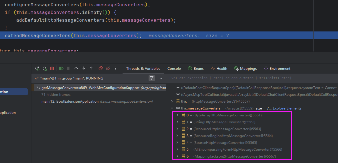 extendMessageConverters是追加在默认消息转化器的后面,而configureMessageConverters会覆盖默认的消息转化器。我们一起看看源码就知道了: