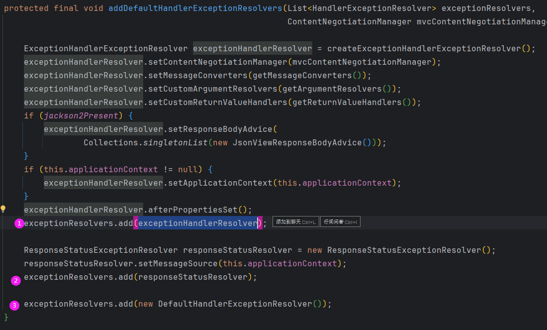 同样configureHandlerExceptionResolvers控制着是否加载默认的异常解析器。默认的异常解析器有三个: