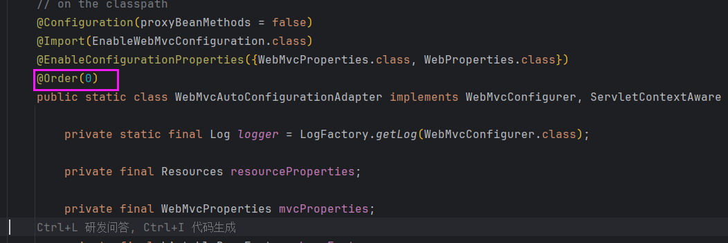 从图上可以知道源码通过@Order限制了加载的顺序,那我们只要将优先级高于@Order(0)即可。