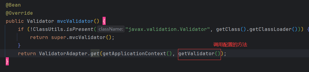如果获取到就使用配置的,如果没有获取到就加载已经存在的Bean(javax.validation.Validator.class)。如果还是没有,就会通过OptionalValidatorFactoryBean创建validator。