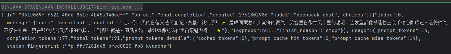 String chat = AIUtil.chat(new OllamaConfig(apiUrl, model), "夸一下帅气的我");