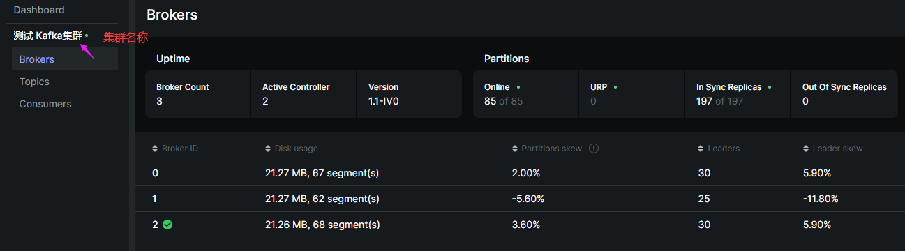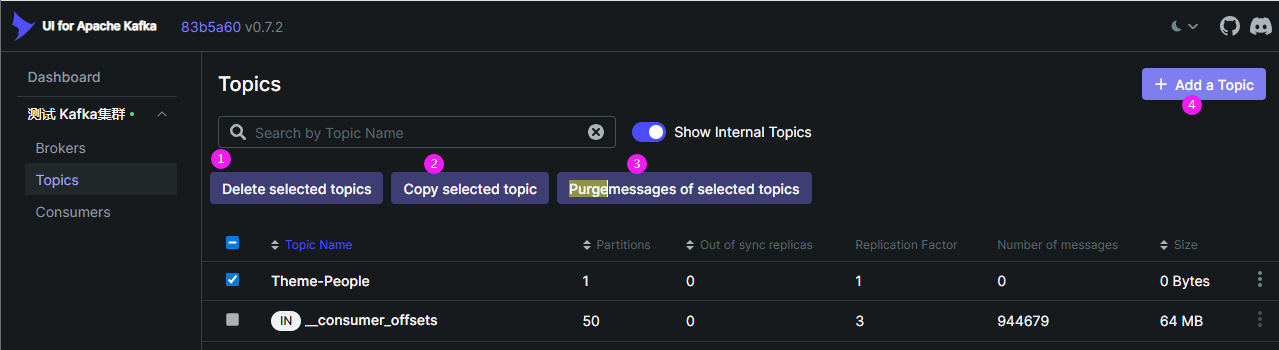 集群下分别有Brokers、Topics和Consumers三个主要信息。其中Brokers和Consumers只能查看,无法操作。最主要的操作对象就是Topics