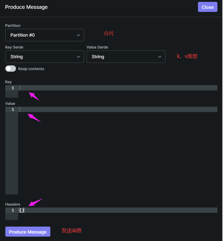 发送消息可以决定从哪个分片发送以及发送K、V的数据类型。发送的消息可以包含key、value以及Headers。