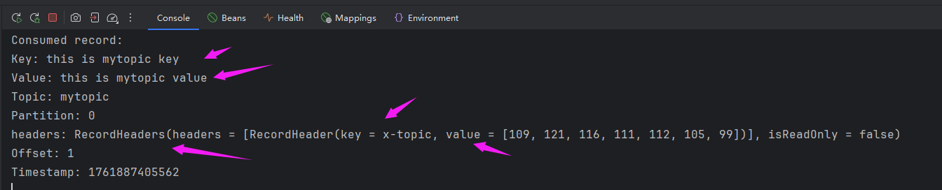消费者获取消息时,可以通过org.apache.kafka.clients.consumer.ConsumerRecord<K, V>类接收,可以获取到所有的信息。