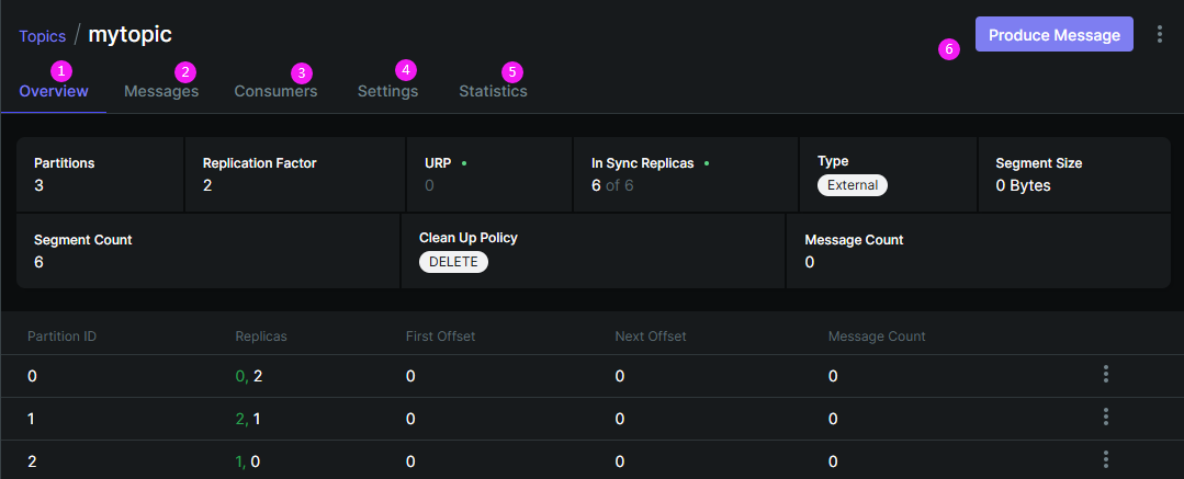 Topic下分别可以查看分片、副本等信息,还可以查看消息、订阅的消费者以及设置预统计。