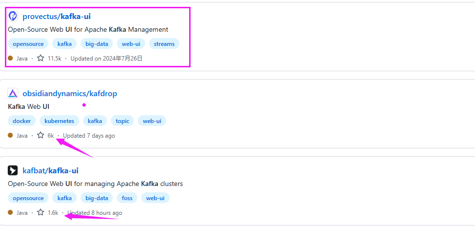 在了解这款kafka-ui之前,其实还有发现了其他两个类似的开源项目,并且star数还不低。