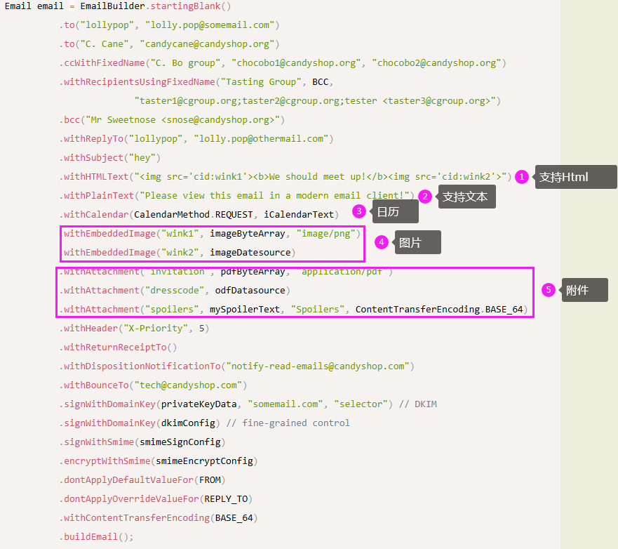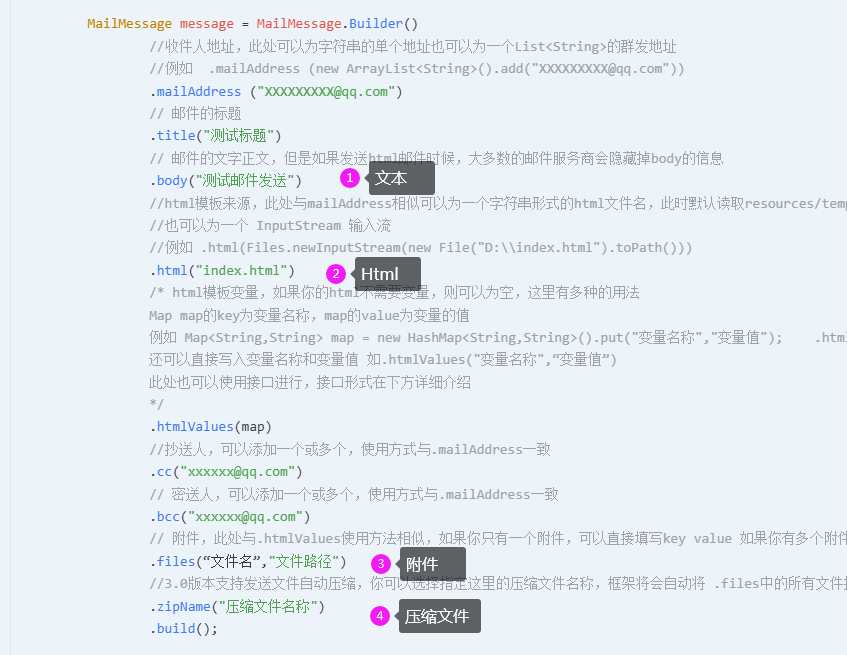 通过MailerBuilder构建发送的客户端,通过EmailBuilder构建发送邮件的具体信息。