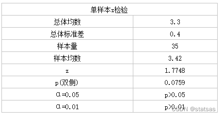 以往通过大规模调查已知某地新生儿平均出生体重为3.30kg,标准差为0.40kg,从该地难产儿中随机抽取35名新生儿作为研究样本,平均出生体重为3.42kg,问该地难产儿出生体重与一般新生儿体重有无差异?