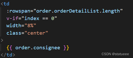 此时需要注意:当我们遍历数组时,有几个订单详情就会遍历几次,需要把rowspan动态赋值为数组的长度,且只显示index=0时的(这里不太懂)