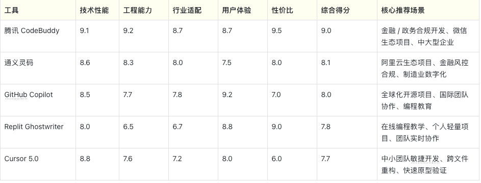 GitHubCopilot(总分 7.8):金融 / 政务场景 6.0 分,合规性不足需额外采购加密服务;互联网 / 制造业 9.0 分,微软生态集成使电商秒杀系统开发周期从 2 周压缩至 48 小时;学生版免费且集成 GitHub Classroom,教育场景 8.5 分。