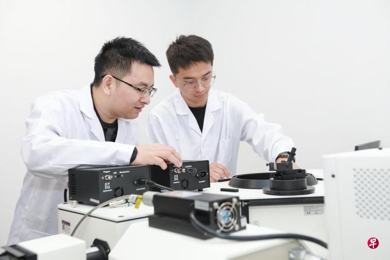 新加坡国立大学与中国黑龙江大学、清华大学合作,在稀土电发光领域取得突破。图为清华大学深圳国际研究生院副教授韩三阳(左)与其学生正在进行实验。(中新社)