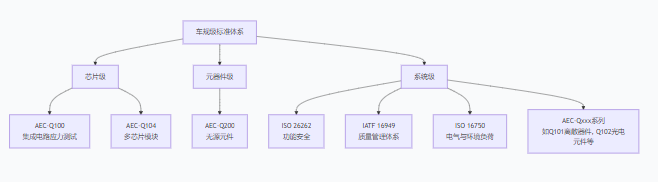 简单来说,车规级标准可以概括为三个层面:**芯片级**、**元器件级**和**系统级**。下图清晰地展示了这一体系架构:
