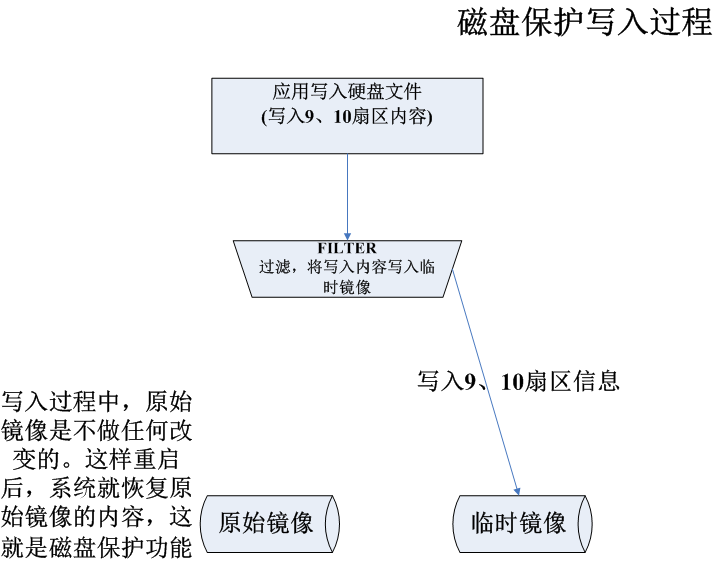写入操作。应用程序操作某个文件,对文件进行写入改动操作,最后会对应到,写入改动硬盘上的某些扇区。而磁盘保护程序会过滤检测到这些扇区操作,将写入转移到其它位置,而不是真正写入到实际硬盘的真实镜像中。如图:
