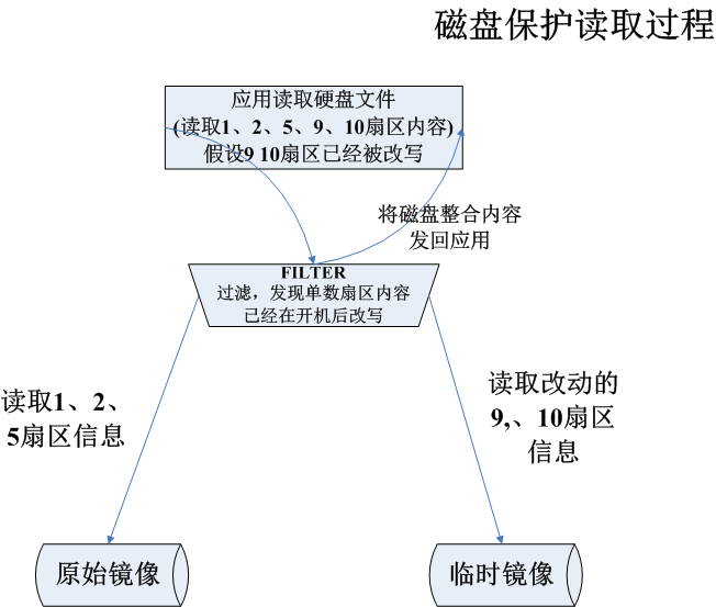 读取操作。当应用程序操作某个文件,对文件进行读取操作。最后会对应到读取硬盘上的某些扇区。这些扇区,某些是之前没做过任何写入改动操作的,直接从真实硬盘原始镜像读取即可。而有些是之前已经进行写入改动操作的,就需要从临时镜像读取。