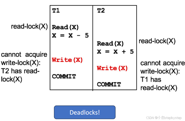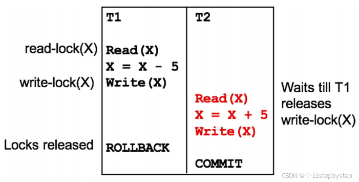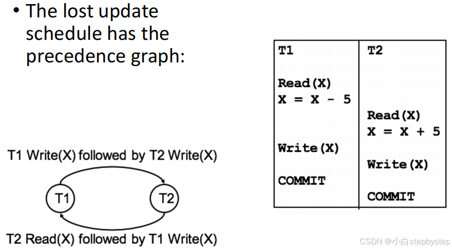 例如:两个事务 T1 和 T2 都读取数据项 X,都修改它,然后都写入。