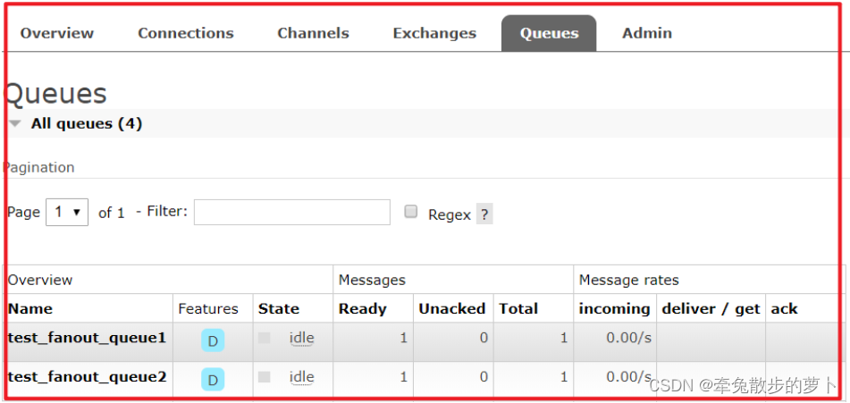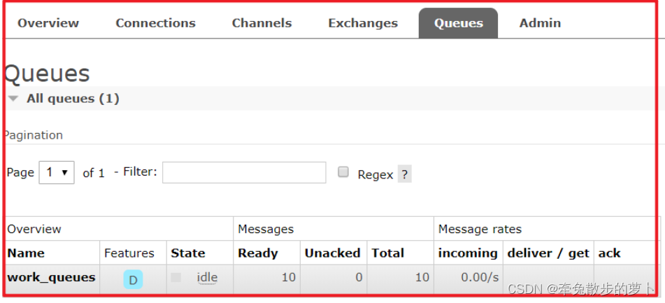 Work Queues与入门程序的简单模式的代码是几乎一样的;可以完全复制,并复制多一个消费者进行多个消费者同时消费消息的测试。