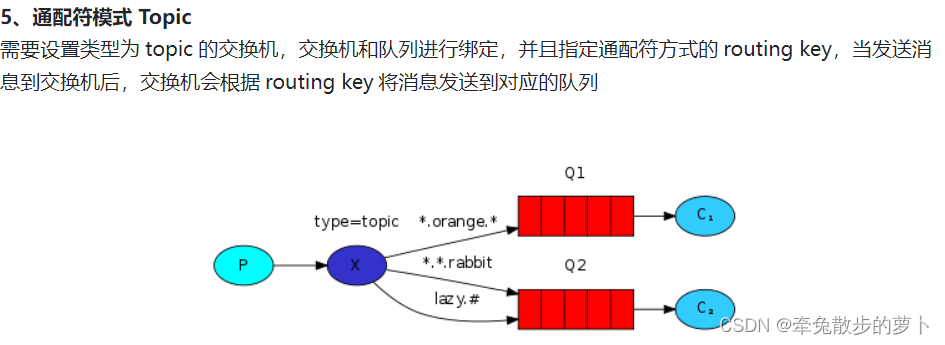 Topic主题模式可以实现 Publish/Subscribe发布与订阅模式 和 Routing路由模式 的功能;只是Topic在配置routing key 的时候可以使用通配符,显得更加灵活。