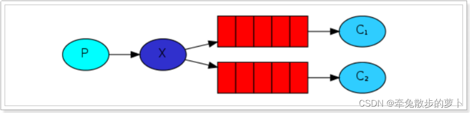 - P:生产者,也就是要发送消息的程序,但是不再发送到队列中,而是发给X(交换机)