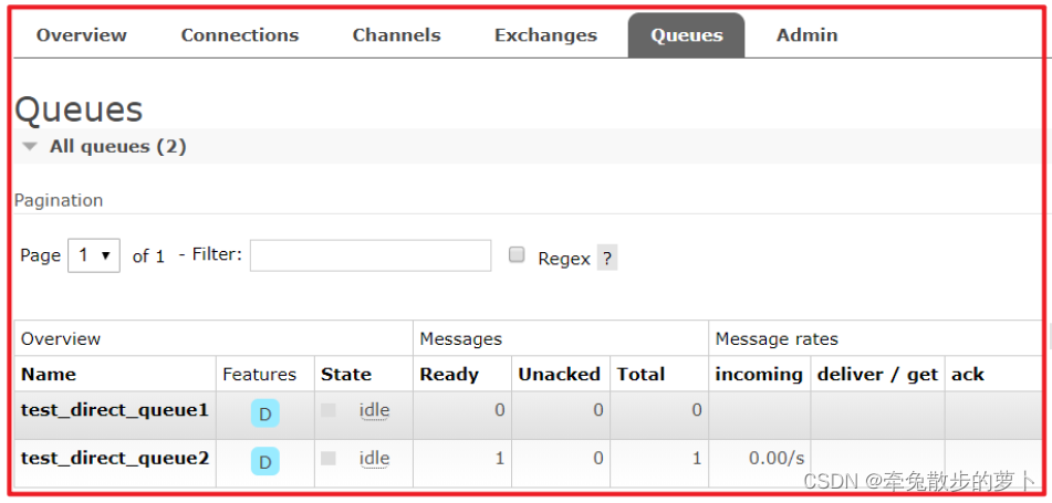 在编码上与 Publish/Subscribe发布与订阅模式 的区别是交换机的类型为:Direct,还有队列绑定交换机的时候需要指定routing key。
