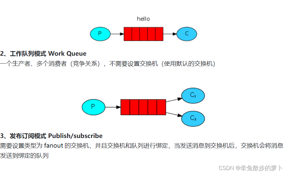 1、工作队列模式不用定义交换机,而发布/订阅模式需要定义交换机。