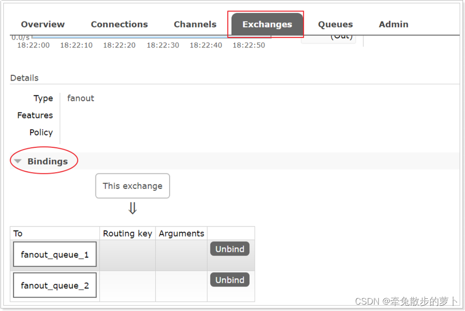 在执行完测试代码后,其实到RabbitMQ的管理后台找到Exchanges选项卡,点击 fanout_exchange 的交换机,可以查看到如下的绑定: