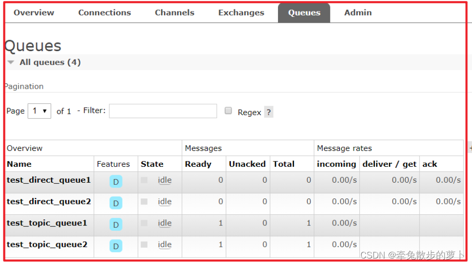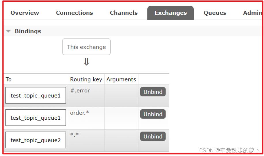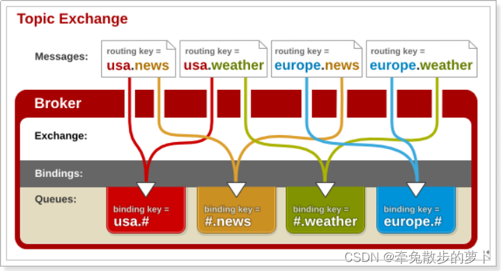 - 红色Queue:绑定的是usa.# ,因此凡是以 usa.开头的routing key 都会被匹配到